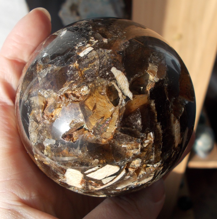 Брекчия дымчатого кварца с полевым шпатом, шар 75 мм на подставке, Володарск-Волынский. Очень красивый необычный шар с включениями лимонита и опала, весь ажурный в пещерках с цельными кристалликами кварца и шпата, в прозрачных окошках просвечивают медовым включения лимонита и опала. ПРОДАН