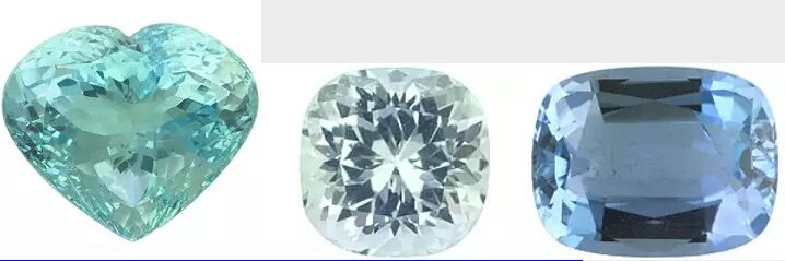 Исторически наиболее ценным цветом аквамаринов считался довольно яркий, насыщенный зелено-синий цвет (цвет морской волны). В настоящее время в подавляющем большинстве на мировом рынке мы видим светлые ненасыщенные голубые камни. Отличающиеся наибольше интесивностью зеленовато-синего цвета аквамарины из нескольких месторождений приобрели свои собственные названия (Аквамарины Санта-Мария и Санта-Роча - по месторождениям в Бразилии; Санта-Мария африканская - мадагаскарские камни схожего оттенка). Аквамарины Санта-Мария (цвет наподобие представленного выше на первой фотографии), точнее сказать - не сами камни, а их название - стали предметами многочисленных "спекуляций". Так стали нередко называть что ни попадя исключительно с цель продать подороже..