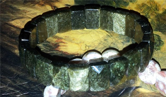 У меня есть браслетик один, внешне красивый очень, продавец уверяла, что это натуральный камень, но точной информации дать не смогла. Как вы думаете это минерал или что-то искусственное? Браслетик тёмно-зелёный, блестит на свету, структура как будто волокнистая или "точечная"